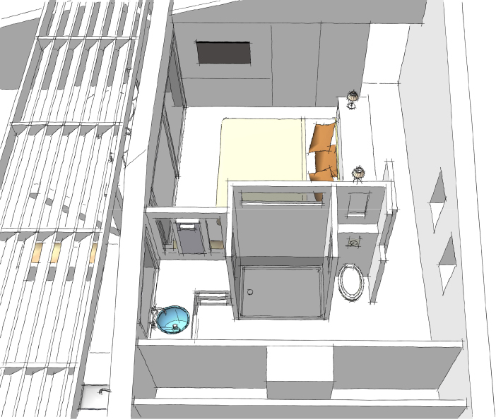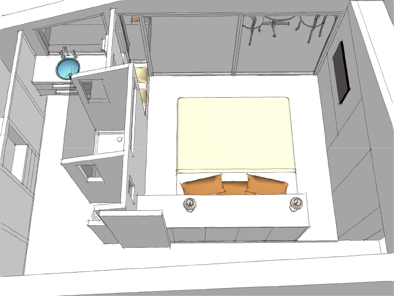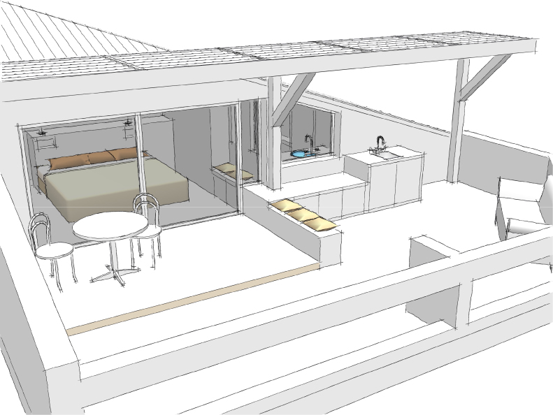 Étude sur le réagencement d’une chambre et de sa salle de bain, ainsi que sur la terrasse attenante avec la création d’une cuisine d’été.